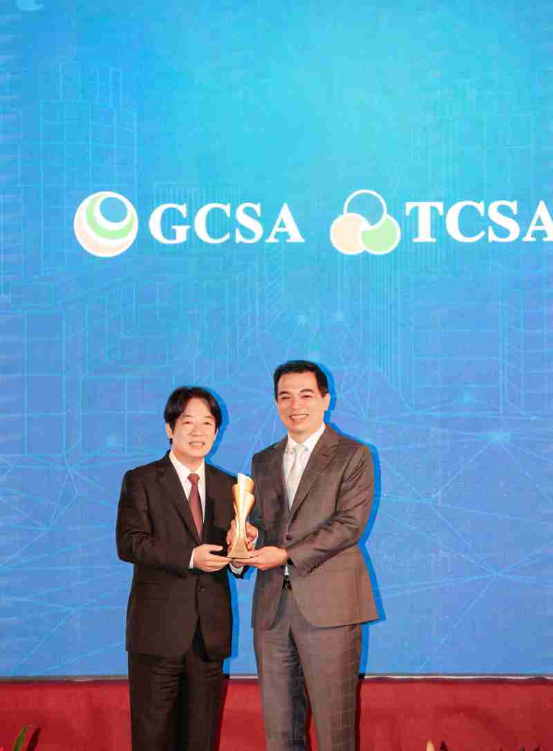 达全方位永续表现获全球永续奖及台湾永续奖肯定,,,,由副总统赖清德颁奖 (左),,欧陆注册总经理柯富仁 (右) 代表领奖