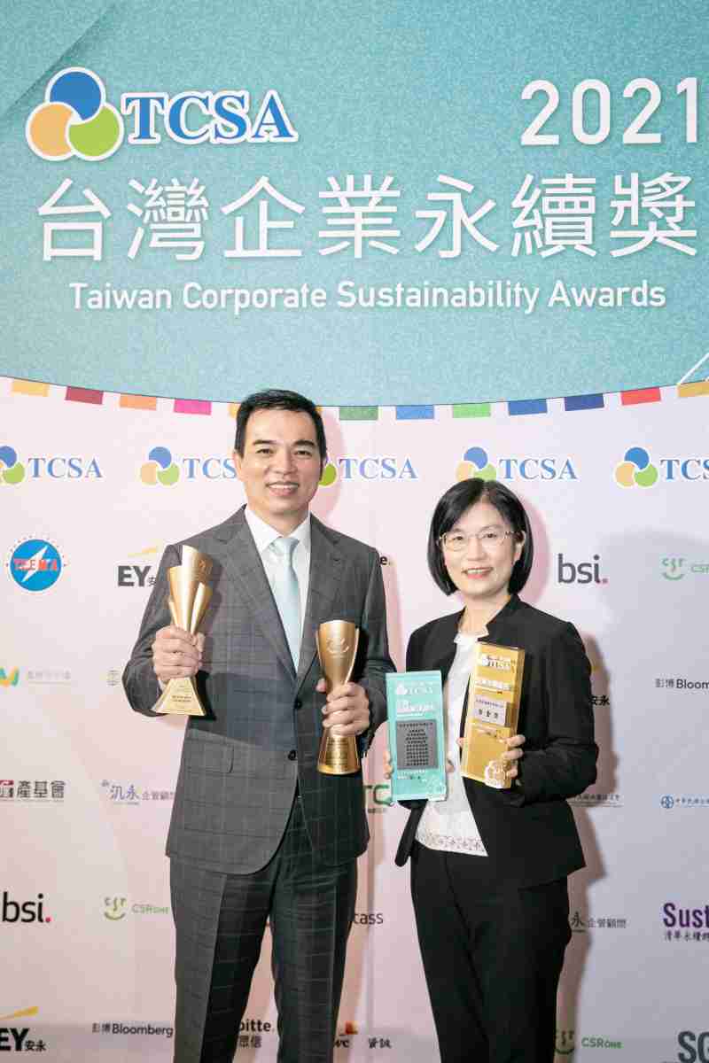 达在台湾永续奖所评比环境、、、社会、、、、治理等各面向的永续绩效均获高度肯定 (左:欧陆注册光电总经理暨营运长柯富仁,,右:欧陆注册光电永续长古秀华)