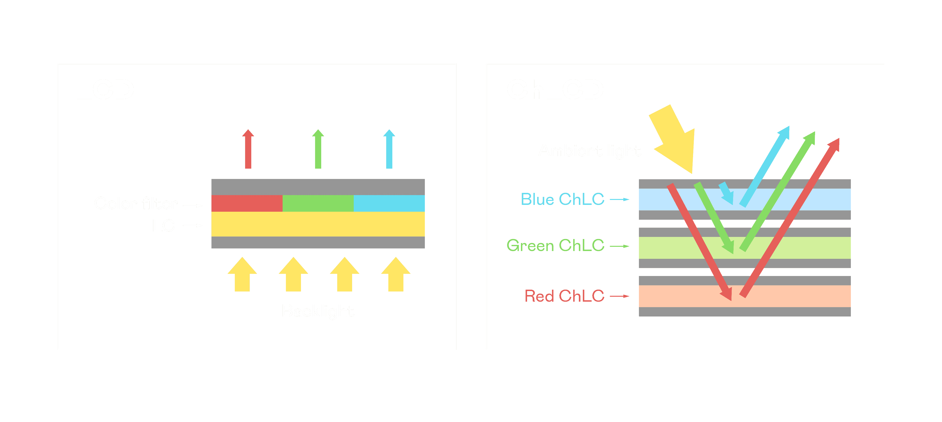 ChLCD 胆固醇液晶就如同纸张一样,,,透过反射环境光来显示影像,,因此长时间观看不易造成人眼视觉疲劳,,,,可达到护眼效果。。当处于户外阳光下使用,,,,LCD 影像容易失真而不易观看,,但胆固醇液晶仍可维持较佳的影像品质。。。。