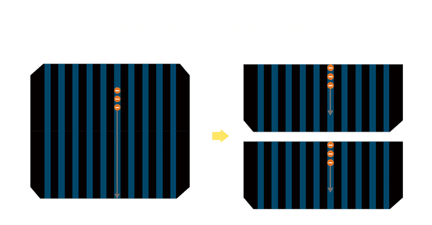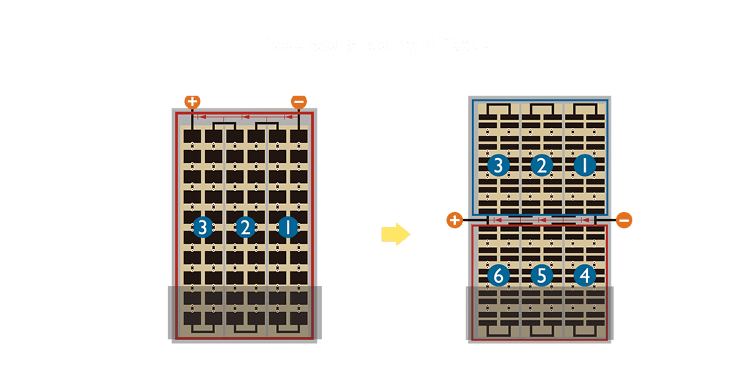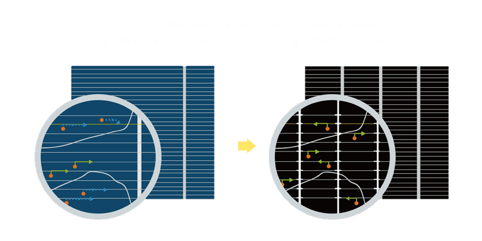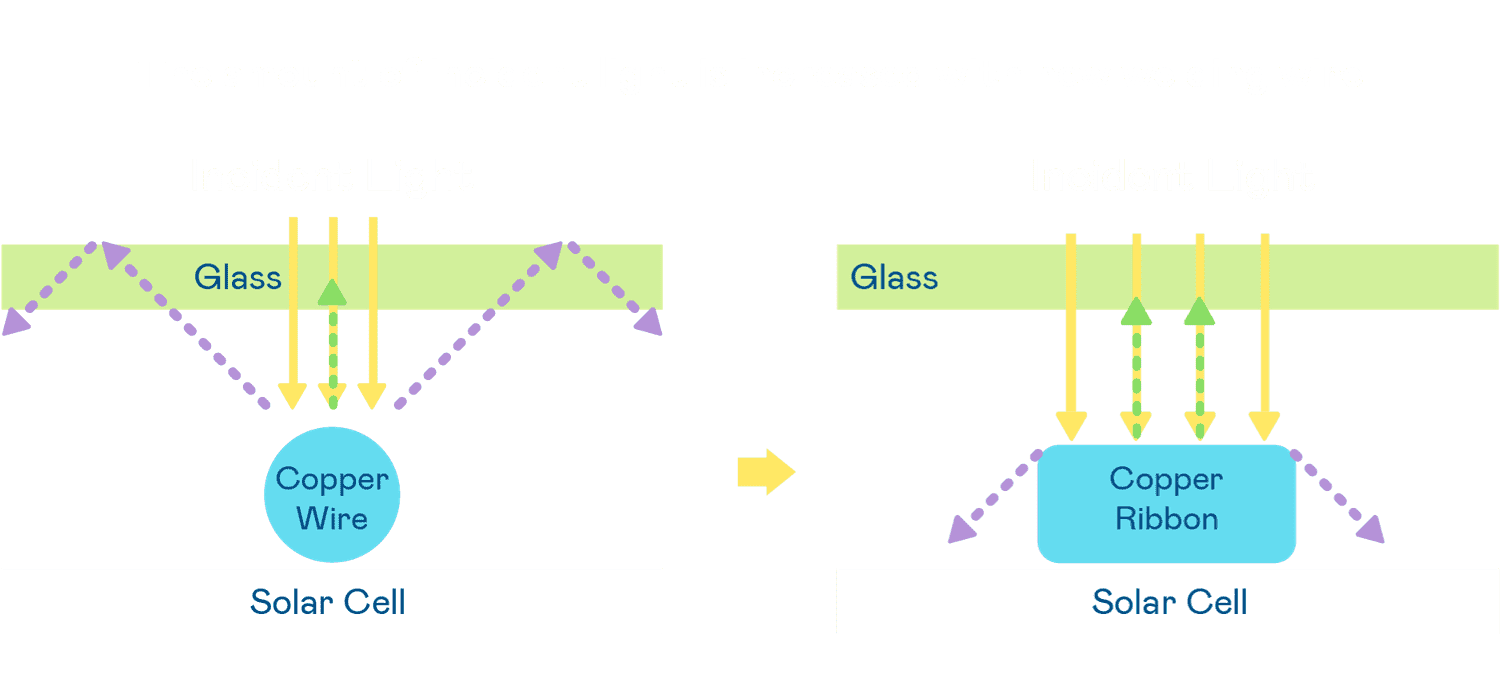 • 电池使用多条铜导线 (Copper wire) 于电池片上形成较短的电流路径,,,,提高电流收集效率,,采用圆形设计的铜导线较传统扁平式的铜焊带 (Ribbon),,可增加入射至电池的光线量。。