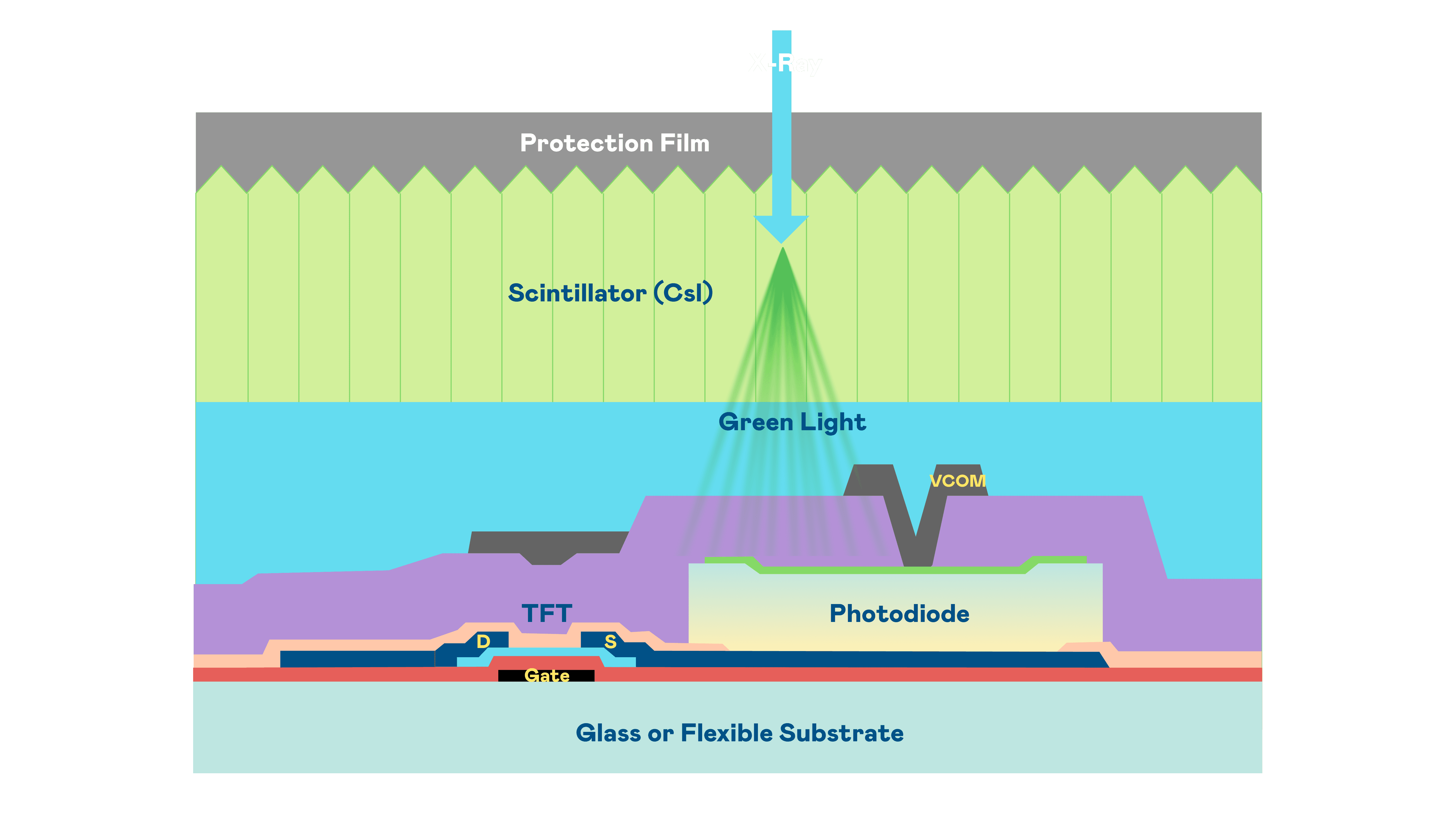 欧陆注册的X光影像感测阵列使用薄膜电晶体 (TFT) 作为每个像素的读取开关,,搭配光电二极体(Photodiode)的光电转换元件,,,,用以感测X光影像讯号。。。。